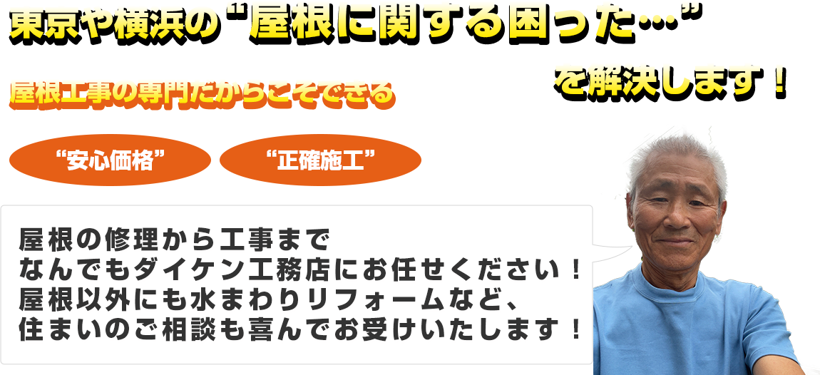 「屋根修理・屋根工事のダイケン工務店」のオフィシャルサイトにお越しいただき、誠にありがとうございます。