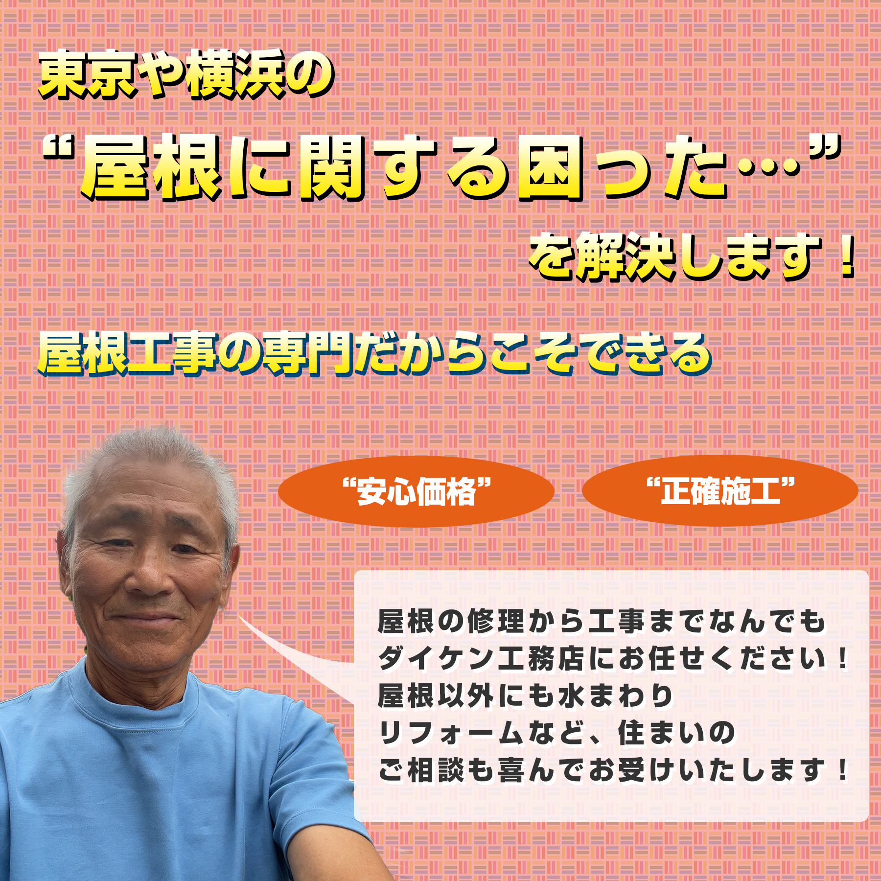 安心価格・納得施工ですので、世田谷市を中心とした東京、横浜エリアで屋根のお困りがございましたらダイケン工務店までご相談ください。
